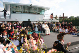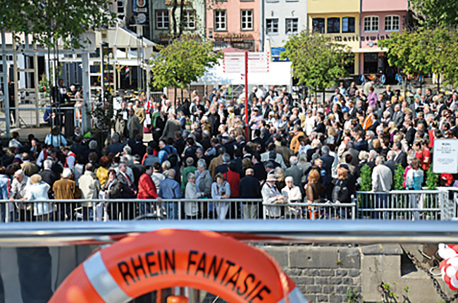 Im Rahmen des Weltjugendtages 2005 in Köln nutzte der damals gerade erst gewählte Papst Benedikt XVI. das neue KD Flaggschiff für die Pilgerfahrt auf dem Rhein. Die Fotos gingen seinerzeit um die ganze Welt. „Das war unfassbar beeindruckend. Unzählige Menschen säumten die Ufer und jubelten dem Papst zu“, sagt Norbert Schmitz. An Bord selbst war die Menschenmenge eher überschaubar. Die Sicherheitsanforderungen waren, wie während des Papstbesuches überall in der Stadt, sehr hoch. So waren beispielsweise die Rheinbrücken, unten denen das „Papstschiff“ hindurch fuhr, gesperrt und leer. Die Liste derer, die mitfahren durften, war ebenfalls entsprechend kurz. Aus welchen Gründen auch immer fehlte der Name eines bekannten Herrn aus der Kölner Stadtgesellschaft, der fand, er und seine Gattin müssten auf jeden Fall mit aufs Schiff. Schmitz sollte das doch bitte möglich machen. Erneut musste eine kölsche Lösung her. Noch heute mögen einige der damals Anwesenden rätseln, warum besagter Herr an dem Tag als Kellner Tabletts mit Häppchen durch die Reihen trug, während seine Ehefrau in der Spülküche im Einsatz war.