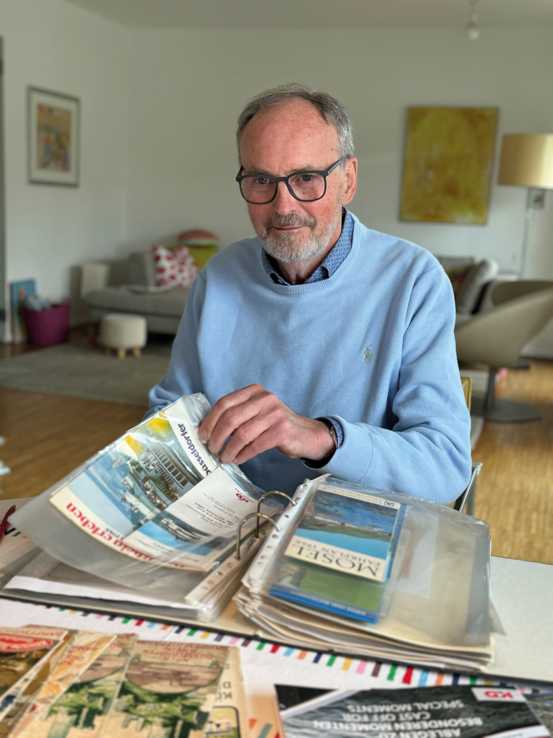 Der Köln-Düsseldorfer ist er nach wie vor verbunden. „Ich freue mich sehr auf das Jubiläum im kommenden Jahr, immerhin war ich 36 Jahre meines Berufslebens ein KD-ler.“ Bereits während dieser Zeit hat der jetzt 73-Jährige angefangen, privat Dinge über und zur KD zu erwerben und zu sammeln. Dazu zählen historische Reiseführer, Karten, Plakate, Fotos sowie Dokumente und alte Speisekarten. „Das ist spannend, die Speisen und Getränke spiegeln den jeweiligen Zeitgeist wider. Was auf den Schiffen angeboten wurde, beschäftigte damals durchaus auch die Mitglieder des Aufsichtsrates. So war der ehemalige Vorsitzende des Aufsichtsrates, Dr. Helmut Keßler, eine Art kulinarischer Anwalt für das „Russenei“. Er war der Meinung, dass das Gericht unbedingt auf unsere Speisekarte gehöre“, erinnert sich Schmitz schmunzelnd.