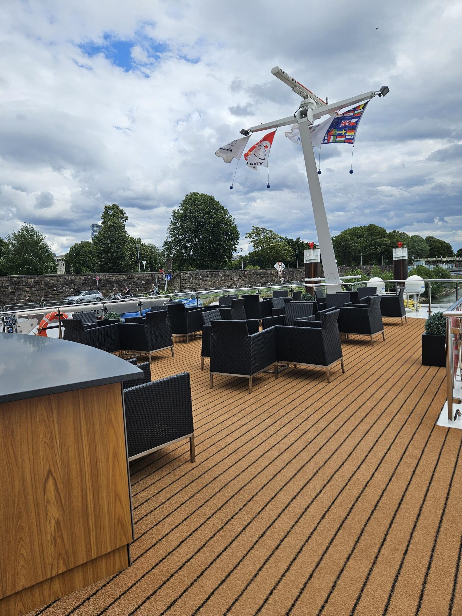 70 cabins, some with French balconies, invite you to relax after the trade fair. The ship also has a panorama lounge, an exclusive restaurant, a more intimate lounge and a library at the rear of the ship as well as a spacious sun deck.